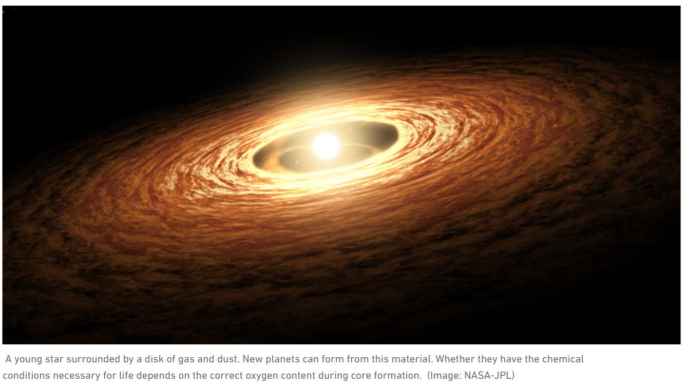 Astronomers may be able to estimate these chemical conditions by studying other solar systems with large telescopes. The oxygen available during planet formation depends on the chemical makeup of the host star. Because planets form mostly from the same material as their star, the star’s composition helps shape the chemistry of the entire planetary system.