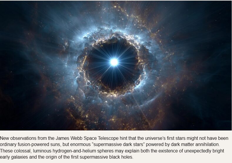 New observations from the James Webb Space Telescope hint that the universe’s first stars might not have been ordinary fusion-powered suns, but enormous “supermassive dark stars” powered by dark matter annihilation. These colossal, luminous hydrogen-and-helium spheres may explain both the existence of unexpectedly bright early galaxies and the origin of the first supermassive black holes.