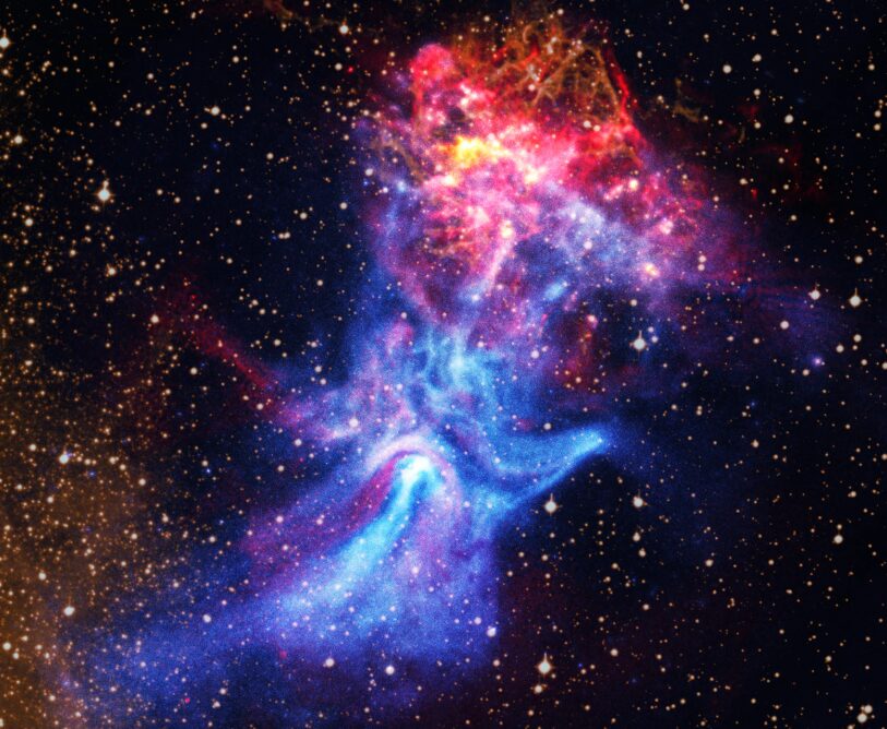 In 2009, NASA’s Chandra X-ray Observatory released a captivating image: a pulsar and its surrounding nebula that is shaped like a hand. Since then, astronomers have used Chandra and other telescopes to continue to observe this object. Now, new radio data from the Australia Telescope Compact Array (ATCA) has been combined with Chandra’s X-ray data to provide a fresh view of this exploded star and its environment, to help understand its peculiar properties and shape.