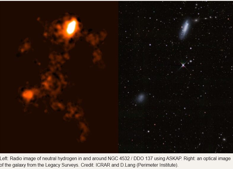 Astronomers have made a groundbreaking discovery of a colossal bridge of neutral hydrogen gas linking two dwarf galaxies. Scientists at The University of Western Australia’s node of the International Centre for Radio Astronomy Research (ICRAR) have made a remarkable discovery: a massive structure stretching about 185,000 light-years between two galaxies, NGC 4532 and DDO 137, located some 53 million light-years from Earth.
